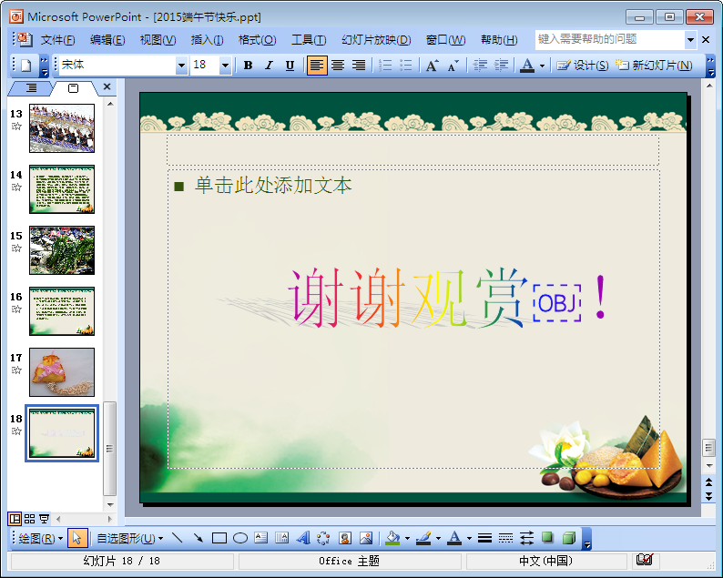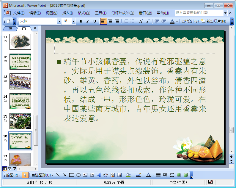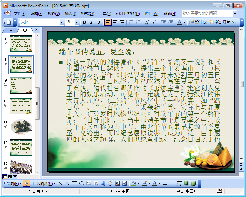 2017年端午节就要到来,东坡小编首先祝所有的朋友们节日快乐哦!另外,为了表示诚意,小编在此特意为大家整理带来了这份带有2015端午节快乐字样的ppt,以下有该ppt的相关内容介绍,怎么样?是不是有一股端午节的节日气息扑面而来呢?其实这份ppt更多的篇幅是在对端午节这一节日的来历及习俗做介绍,想要了解的朋友们就一起来看看吧!