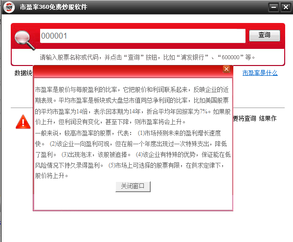软件为市盈率查询工具,并不构成任何股票操作建议,请不要将查询 结果作为股票操作依据。如果由此带来投资损失,责任自负!