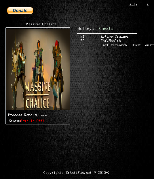 《巨圣杯》三项修改器,基于1.0版本游戏,MrAntiFun制作,具有无限生命,快速科研等功能,使用时先运行游戏,再启动修改器。