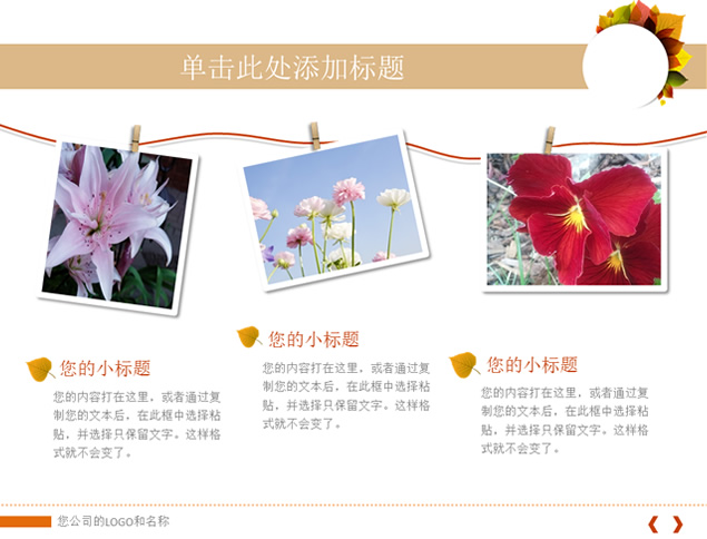这里分享一份创意多彩枫叶简洁商务ppt模板,整体幻灯片活力清爽,还有清新的照片框,喜欢这款枫叶ppt模板的朋友快来下载使用吧。