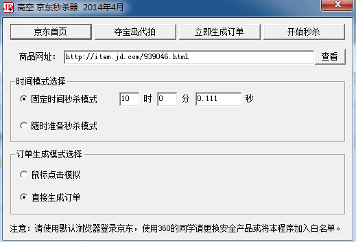 高空京东秒杀器辅助工具,可以定时或者随时监测,可以直接生成订单或模拟鼠标点击。秘杀概率低,聊胜于无吧,有需要的赶紧来下载使用吧。