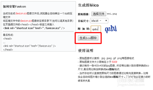 打开ICO在线制作网站,导入准备好的图片,选择适合尺寸大小,一般是16*16。生成即可。如图: