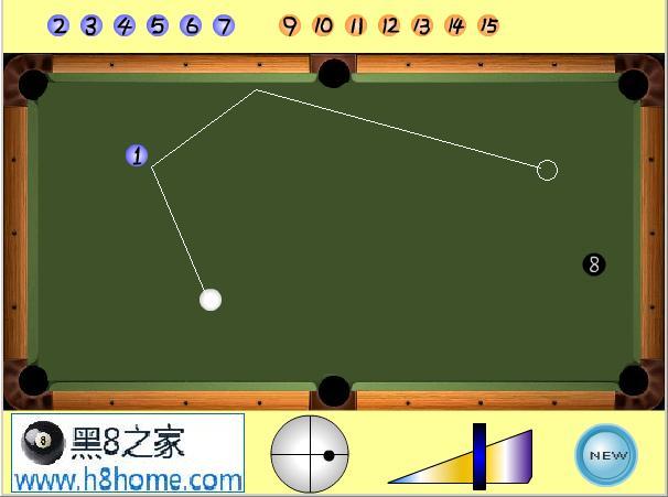 注:母球击球点也可以自由拖动,力度条也是自由拖动,按钮“new”键可以返回最初未摆球界面。截图方法自由发挥,后期图片中球的滚动路线画制可以用windows自带的画图板。