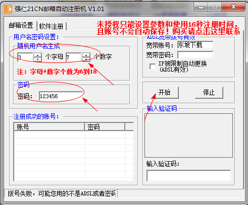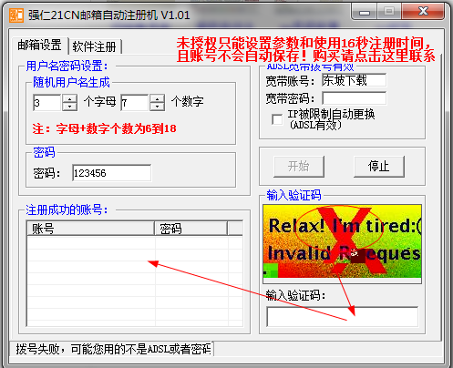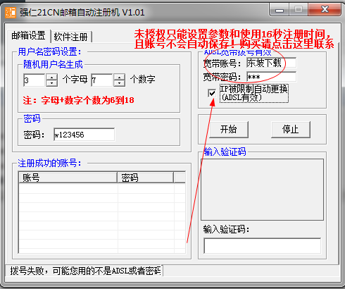 本软件就能实现您方便快捷地注册邮箱的愿望。它本身相当的高智能,首先它能够随机的生成用户名,避免了平时我们在网页中注册邮箱的繁琐选择,另外如果您是ADSL用户,可以填写好宽带账号,并打勾“IP被限制自动更换”,这样就能源源不断的注册邮箱账号了!