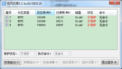 例子1:要安装(或批量安装)还原,并且c,d,e 分区保护,密码为 123 。