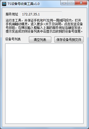 运行本工具,并保证手机和PC在同一局域网段内,打开手机端触动精灵,进入更多>关于及说明,点击发送设备号按钮,在弹出输入框输入上面的服务地址后确定发送,提示发送成功则设备列表中会显示出受到的设备号信息。