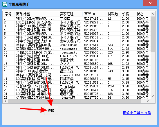 下载解压后,打开软件,点击“提取”然后就出来一群字,上面写着商品-旺旺-ID-付款数-价格-状态