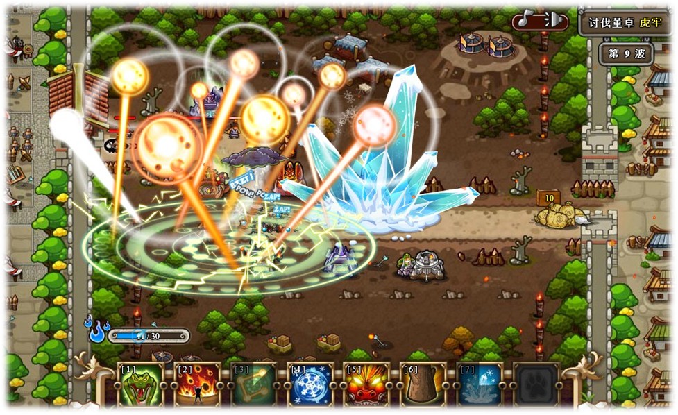 冰封:单体伤害高略低烈火、范围大略大烈火、有减速效果。