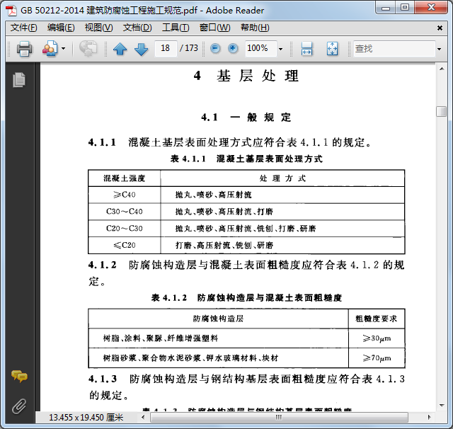 GB 50212-2014建筑防腐蚀工程施工规范在《建筑防腐蚀工程施工及验收规范》GB50212-2002的基础上修订完成,这份规范在2015年1月1日开始实行,共分15章和2个附录,主要技术内容是:树脂类防腐蚀工程、水玻璃类防腐蚀工程、聚合物水泥砂浆防腐蚀工程、块材防腐蚀工程、喷涂型聚脲防腐蚀工程、涂料类防腐蚀工程、沥青类防腐蚀工程、塑料类防腐蚀工程、安全技术、环境保护技术等。这里分享建筑防腐蚀工程施工规范GB 50212-2014pdf高清电子版,书籍共计173页,欢迎大家下载阅读。