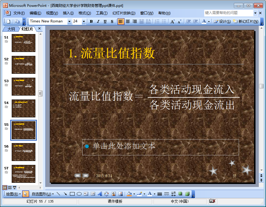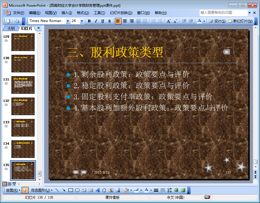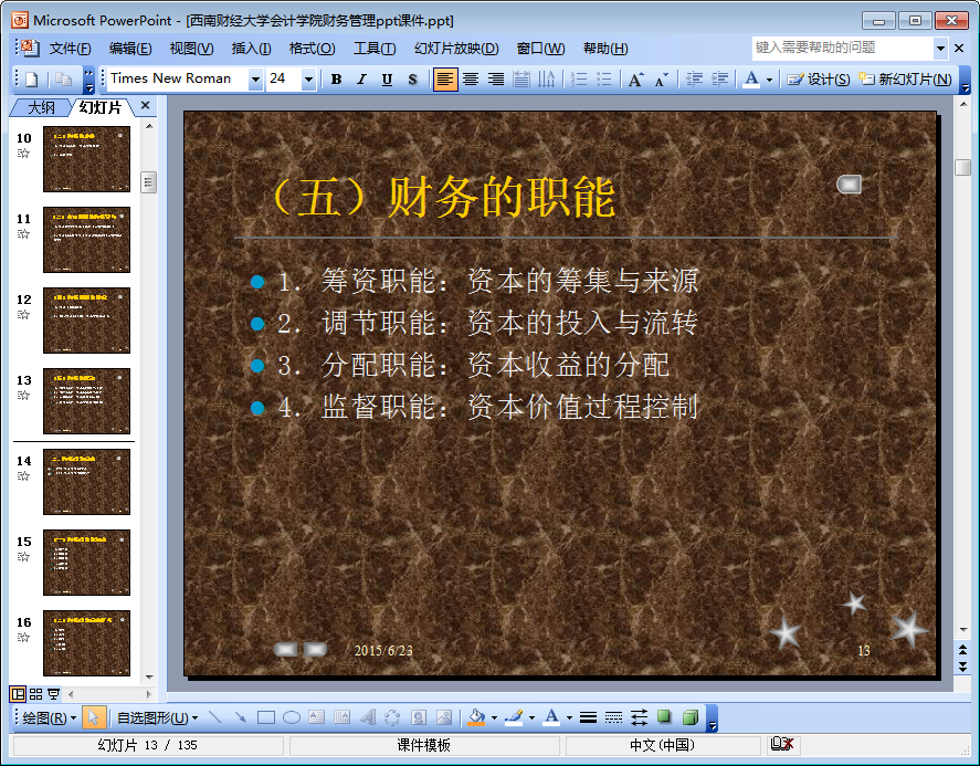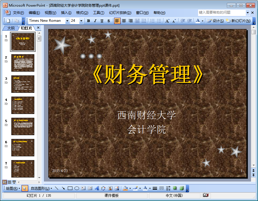 这是一份来自西南财经大学会计学院的关于财务管理的ppt课件。该ppt课件共由135页组成,ppt内容详细介绍了财务基本理论、风险与报酬、财务评价等与财务管理相关的内容,如果你需要一份财务管理ppt课件,不妨点击本文相应的下载地址下载查阅该ppt吧!