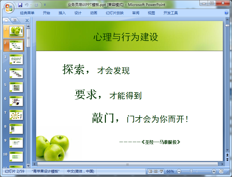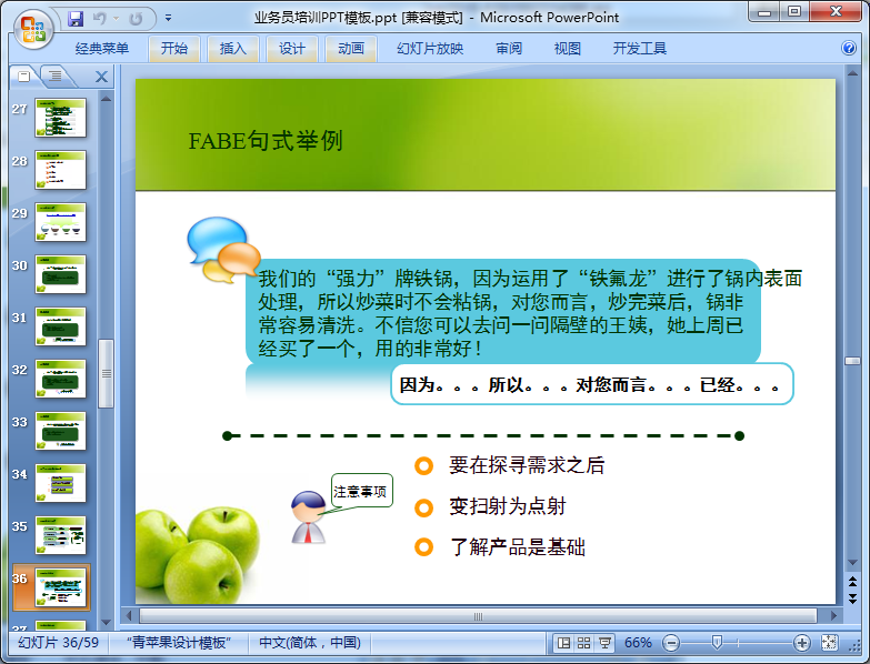 业务员培训PPT动态模板共计59页,采用青苹果背景图片,内容详细完整,适合用在企业销售培训,业务员培训ppt课件,有需要的朋友点击下面的地址即可免费下载这份销售培训课件ppt。