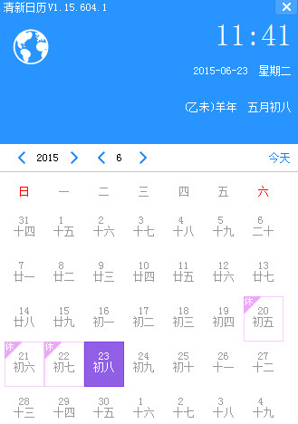 提供天气预报,公农历对应,假日节气查询,放假安排查询,城市地理位置,实时显示PM2.5值等生活功能。还能查询历史上的今天发生过的事件,操作简单,小巧不占用系统资源。