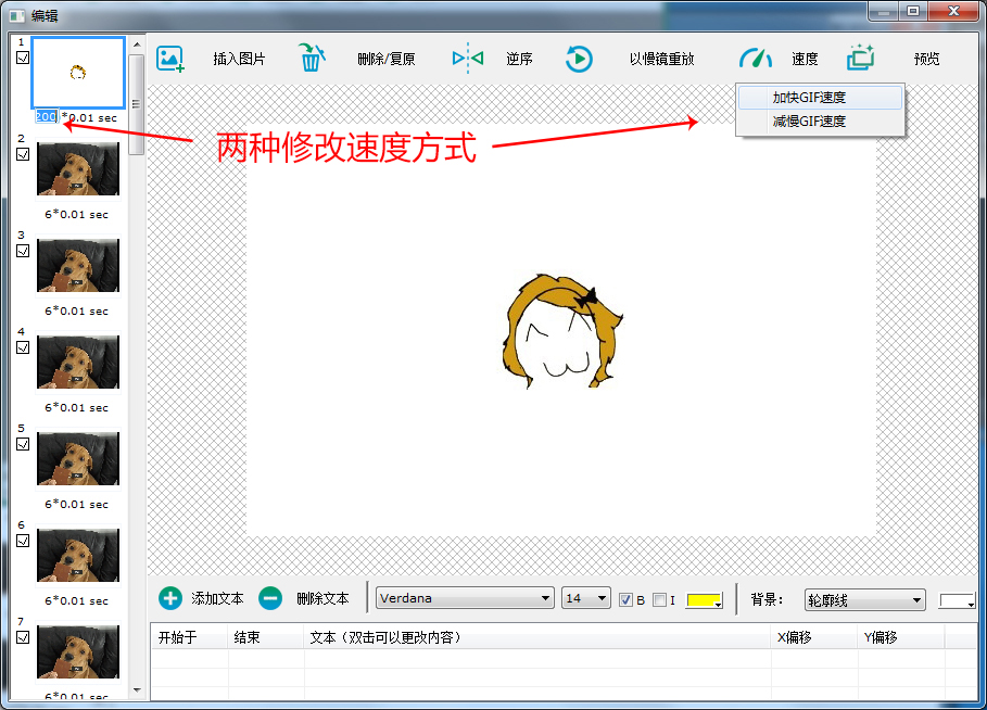 速度:根据需要加快或减慢最终生成的gif播放速度,达到想要的最佳效果,也可以在左区域针对每张图直接调整速度。