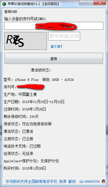 1、打开运行软件,输入手机序列号及验证码,单击查询即可。