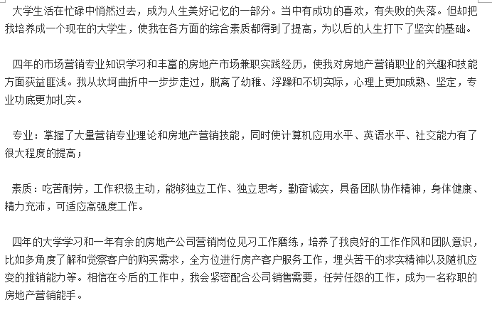经过十多年的寒窗苦读,很庆幸自己考上了福建师范大学成为一名本科生。在大学期间,自己所学的专业是市场营销专业,从高考填报志愿的时候就选择了市场营销专业,很喜欢这个专业,也很庆幸自己所学的专业符合自己的兴趣爱好。通过大学四年的努力学习,自己的各方面能力得到了很大的提高,尤其在市场营销专业的理论知识方面有很大的提升,通过实习期间的社会实践,通过理论加实践的社会实战,在公司里得到了经理的认可,也证明了自己通过大学四年的学习具备了一定的社会实践能力。回首这大学四年,我可以充满自信的告诉自己:“我没有虚度这大学四年,我有能力参加社会工作!”