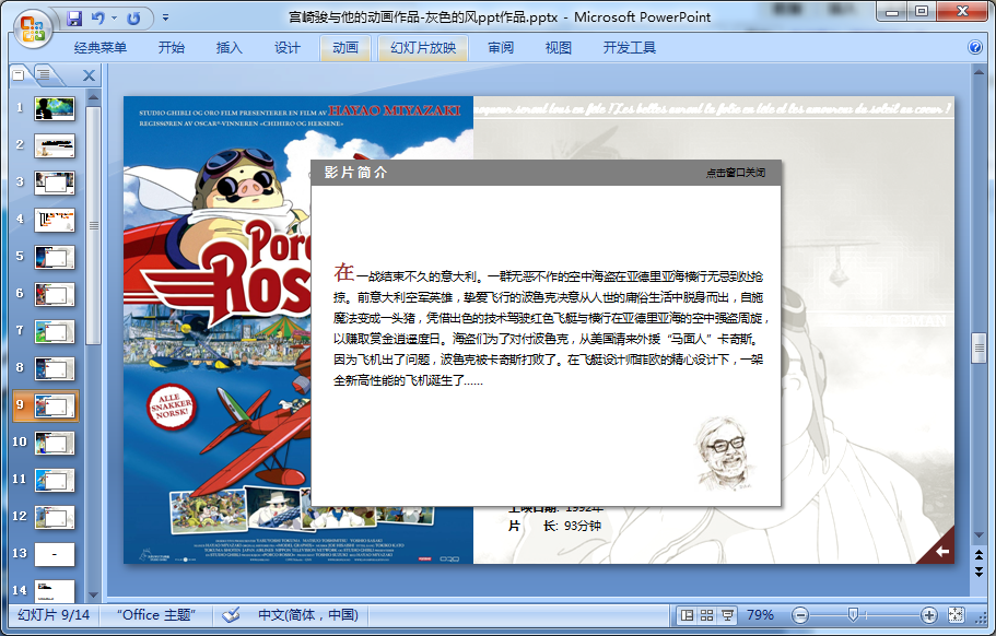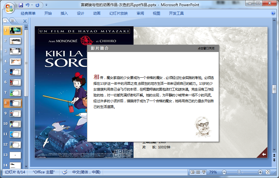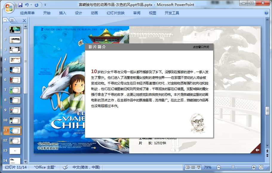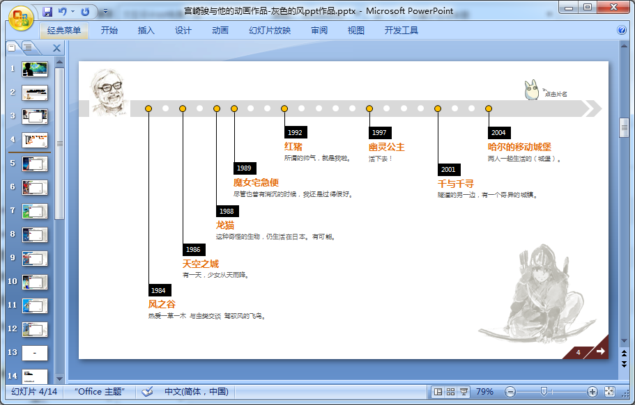 爱看漫画的朋友应该会知道宫崎骏,宫崎骏是日本著名的动画导演、动画师及漫画家,有很多经典的动漫作品,风之谷、天空之城、龙猫、千与千寻······宫崎骏与他的动画作品ppt以时间轴的形式介绍了宫崎骏的经典动画作品,采用交互设计,点击下面的地址即可免费下载这份宫崎骏动画介绍ppt。
