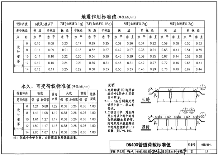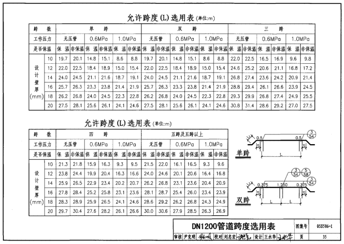 2、介绍了管径为DN300~1800mm十三个规格、工作压力≤1.0MPa的室外给排水自承式平直形架空钢管的厚度选择、允许跨度、支承点力学计算值、支座做法和支墩设计例题等。