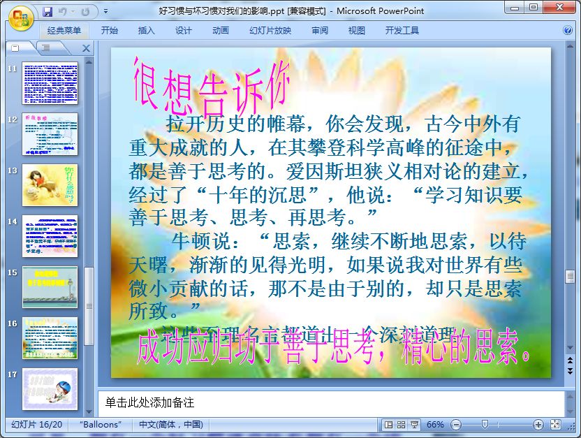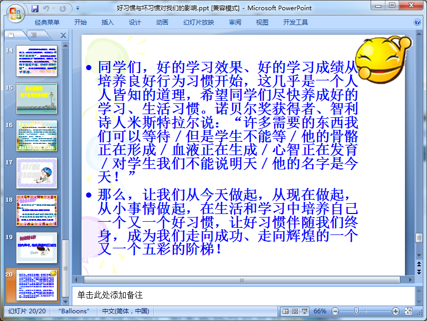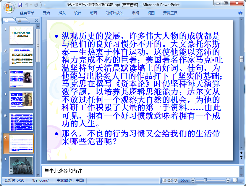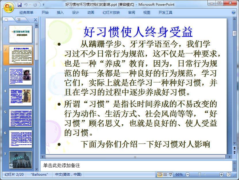 养成一个良好的习惯从小就要开始教育,下面这份好习惯与坏习惯对我们的影响ppt是专为老师准备的ppt课件,这份ppt课件共计20页,点击下面的地址即可免费下载。