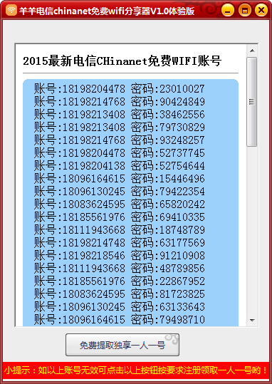 羊羊电信chinanet免费wifi账号分享器是一款绿色免费电信chinanet账号获取器,可以获取电信wifi账号密码,只要有chinanet覆盖的地方就可以实现免费上网功能了。