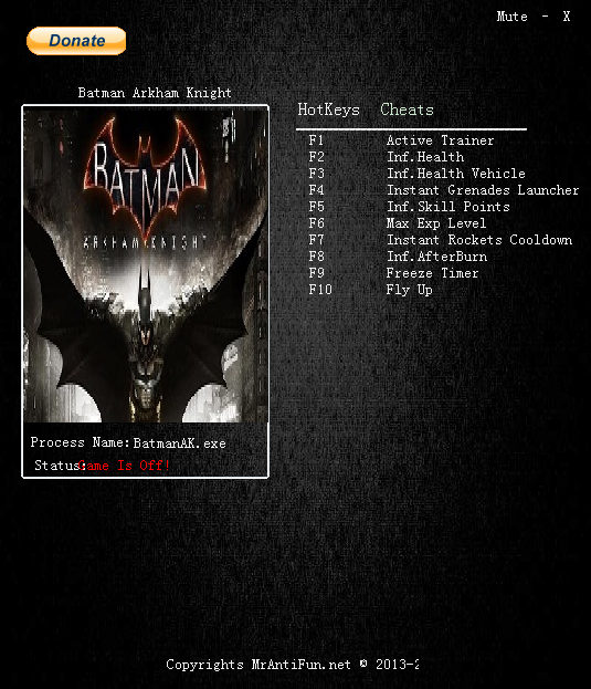 蝙蝠侠:阿甘骑士九项修改器1.0,MrAntiFun制作,游戏当前第一个修改器,有无限生命、载具无限生命等九项功能,让你更加快意的玩游戏,有爱自取。