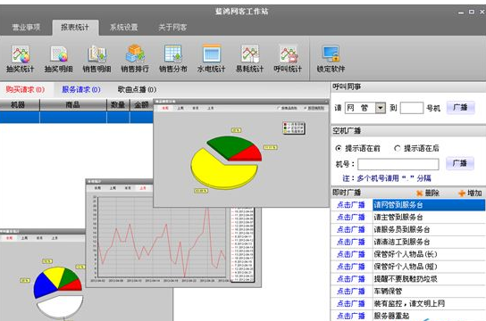 专业,3.0版本足以可以看出蓝鸿网客在网吧管理功能的专业性。比如:抽奖按奖品统计抽奖帮助核算抽奖成本;按会员统计抽奖帮助展开活动锁定目标客户;比如销售分布帮助核定促销的有效性;呼叫统计更是可以看出网吧当前的服务工作的最大问题,以及服务工作量的核算参考;水电、易耗更是帮助网吧管理容易遗漏的“死角”。总之蓝鸿网客在后续版本里将继续深入网吧管理方面的核心问题,帮助解决网吧管理难题。