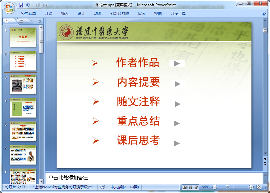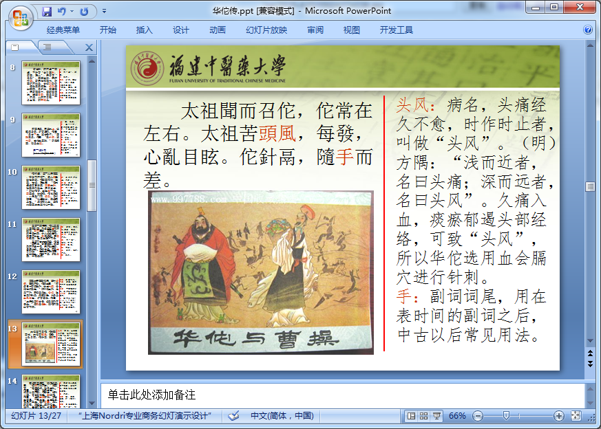 这份华佗传ppt课件主要内容记载了华佗生平事迹,反映了他的医学成就。利用医学案例说明华佗精于诊治各科疾病。这份华佗传ppt共计27页,点击下面的地址即可免费下载完整版。