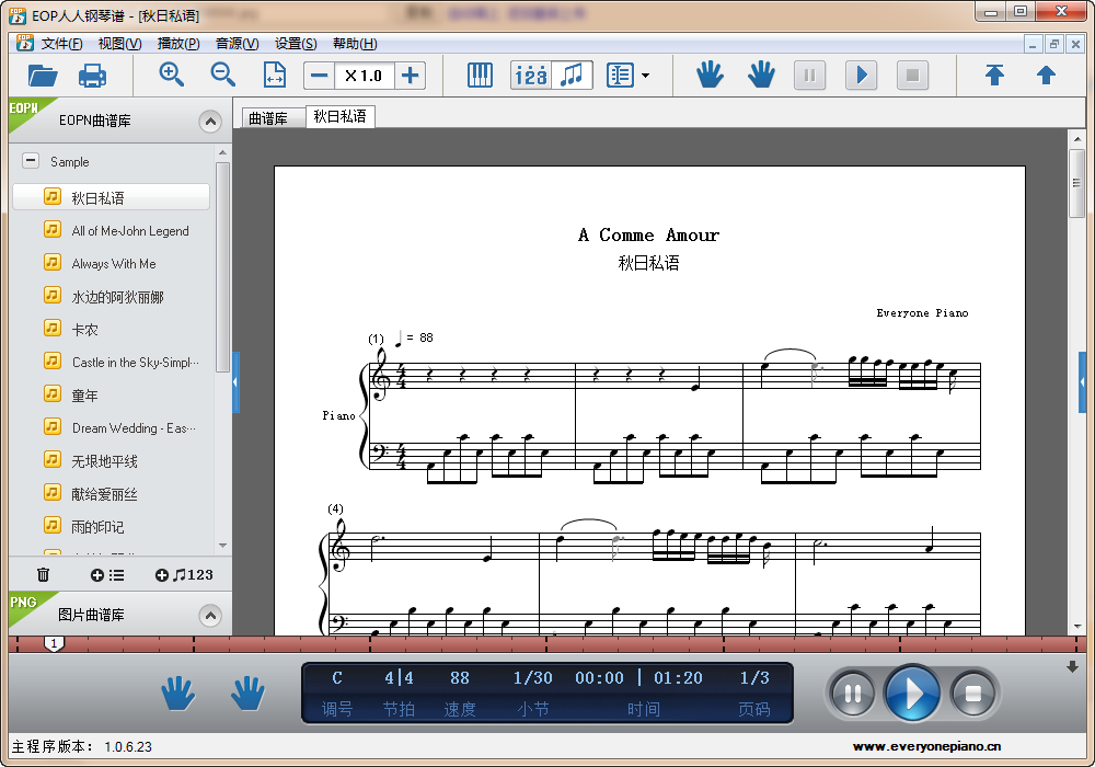 eop人人钢琴谱是一款专业的钢琴谱软件,具有搜谱、播谱、看谱、收藏、打印等功能,通过它可以播放各种琴谱,适合各种层次的钢琴学者们。