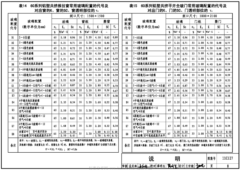 本图集包括50、60、80系列的门窗产品,有固定窗、平开窗、内平开下悬窗、推拉窗、平开门、推拉门、连门窗和组合门窗开启形式的门窗选型、技术要点及相关构造详图。同时图集还提供了不同系列门窗对应不同玻璃配置的门窗传热系数、遮阳系数、可见光透过率的选用表,为设计师根据不同工程要求,选择适宜的节能门窗提供方便。