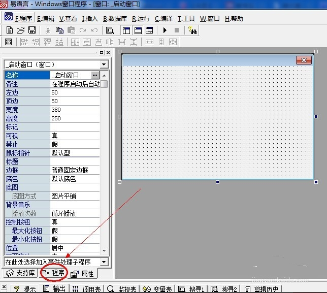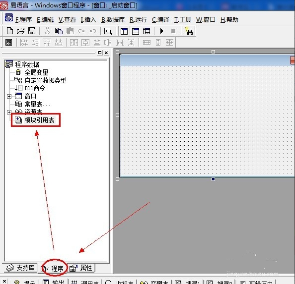 1、打开易语言,创建一个"windows窗口程序",再左侧中间的选项卡,看图。