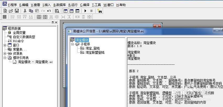 3、加载模块后,可以对着模块单击右键,选择“查看模块信息”就能看到里面有哪些命令,如:“淘宝登陆模块” 是我写的一个例子。