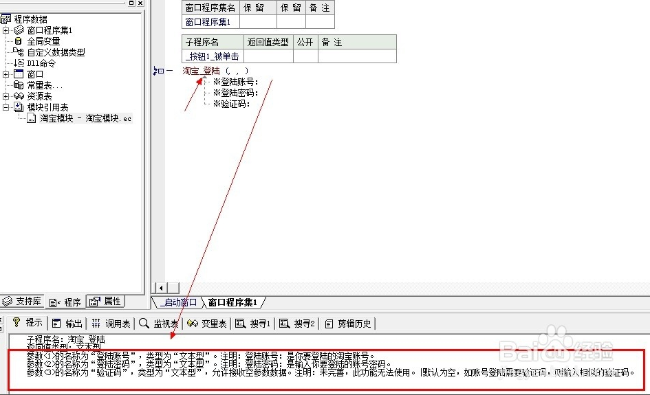 4、在子程序中 添加一条模块中的命令,如:“淘宝_登陆”(注意,只有加载这个模块后,命令才起作用),输入后可以展开所看到的,下面的状态栏还可以看到下面有说明提示。