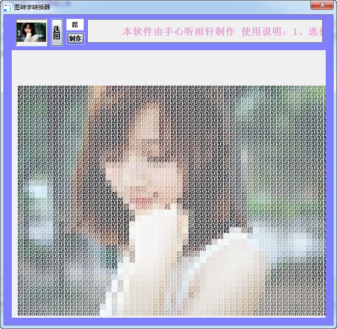 图转字转换器是一款可以将图片用文字来显示的工具,这款软件绿色无毒,简单好用,需要的网友快来下载吧!