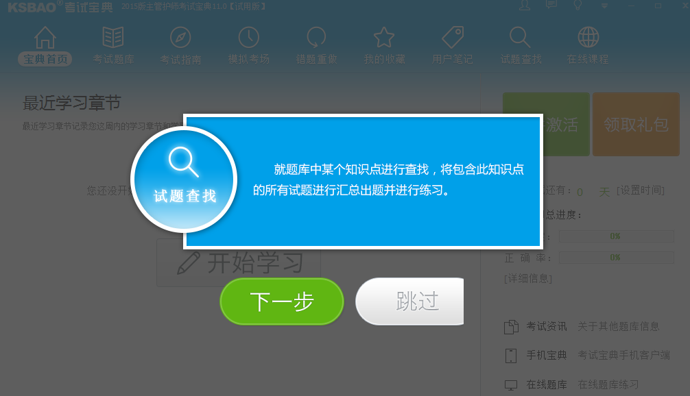 试题查找是《考试宝典》推出的又一项特色功能,它可以以某个关键词为索引进行查找,然后将包含此知识点的所有试题汇总显示,并标明题型与来源,更科学的为考生节约时间。