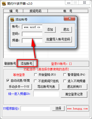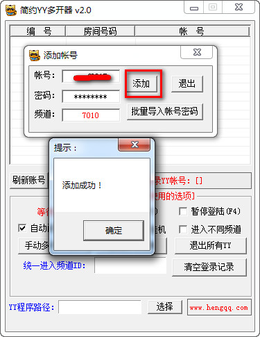 2、也可一个一个添加账号,输入账号、密码及频道点击添加即可。
