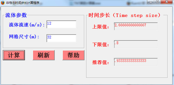 该程序为fluent软件中的非稳态(unsteady)问题中设置时间步长提供参考值,蓝色字体部分表示用户输入项,红色部分表示输出,上限值表示用户可以设定的最大时间步长,一般要小于这个值,而下限是本程序给定的参考范围,用户可以根据自己的实际需要适当调小到下限以下,但是时间步长太小会增加运算时间,所以酌情考虑,推荐值是本程序给定的建议时间步长。网格尺寸一般指的是用户所最关心的区域的网格尺寸,流速是该区域的流速。