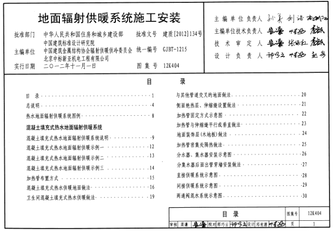 12K404《地面辐射供暖系统施工安装》国家建筑标准设计图集为新编图集,适用于新建民用建筑中以低温热水为热媒或以加热电缆为加热元件的地面辐射供暖系统的设计与施工。改建和扩建的民用建筑可参照执行。