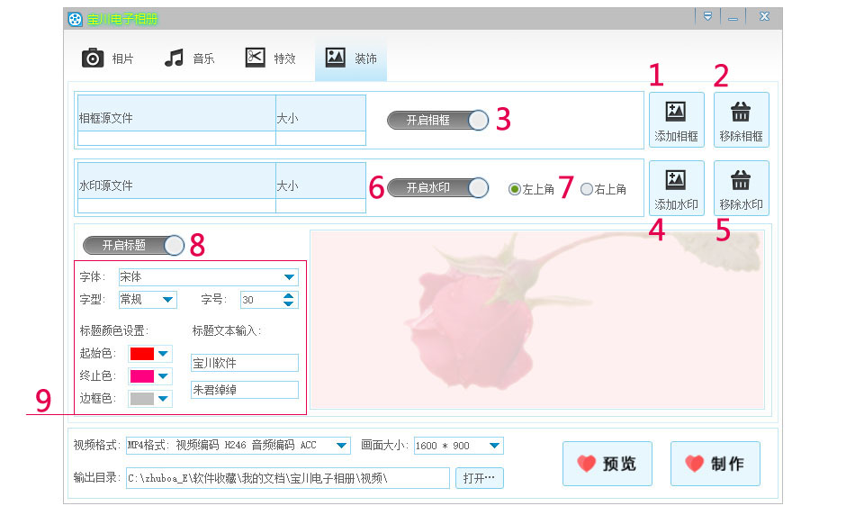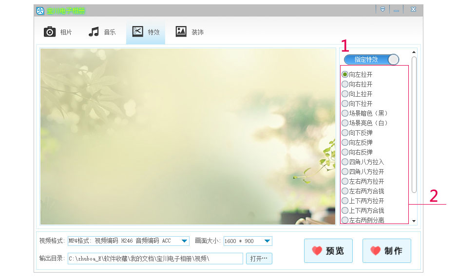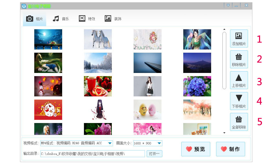 宝川电子相册是一款免费的电子相册制作软件,把相片制作成视频,并且可以配上美妙的音乐,免费,无插件,无病毒,支持多种图片格式,支持多种视频输出格式,制作的视频清晰,可使用其他三方转码软件进行转码。