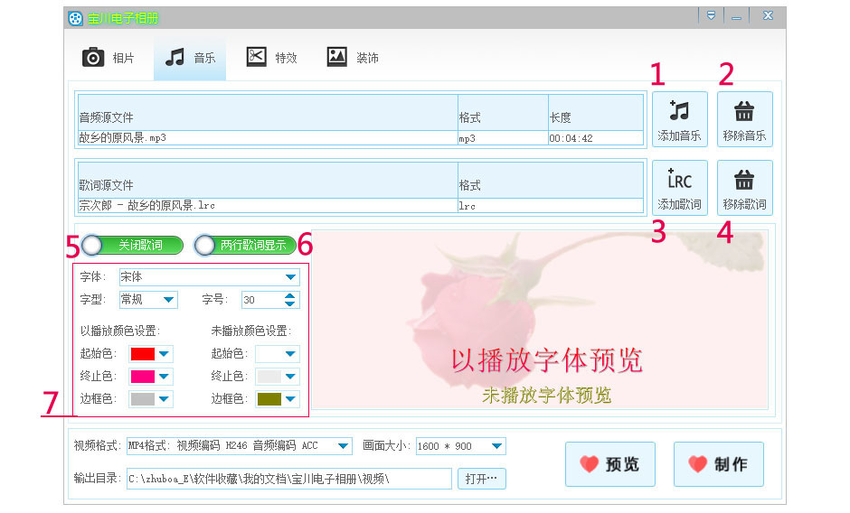 2.音乐 添加移除音乐歌词,对进行歌词设置。