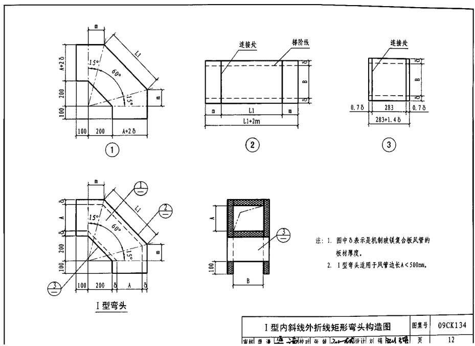 Ⅰ型内斜线外折线矩形弯头构造图12