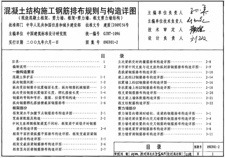 09G901-2《混凝土结构施工钢筋排布规则与构造详图》国家建筑标准设计图集是对06G901-1的补充,是对03G101-1《混凝土结构施工图平面整体表示方法制图规则和构造详图》(现浇混凝土框架、剪力墙、框架-剪力墙结构、框支剪力培结构)国家标准图集钢筋排布的细化和延伸,配合03G101-1图集解决施工中的钢筋翻样计算和现场安装绑扎,从而实现设计构造与施工建造的有机结合,为施工人员进行钢筋排布和下料提供技术依据。