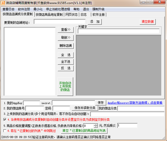软件功能可以输入目标微店(口袋购物)店铺地址自动按该店店铺分类采集所有宝贝,并一键上传到自己的微店里
