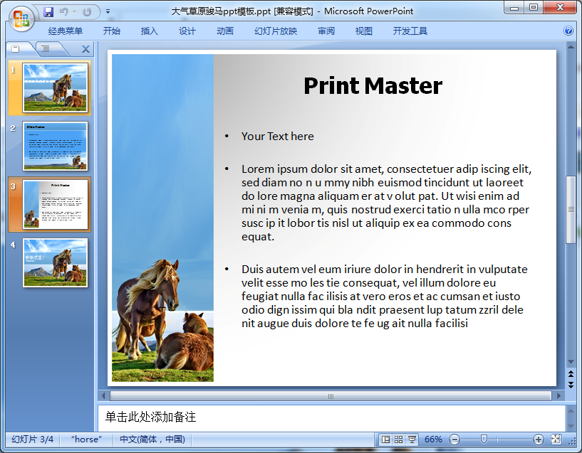 这是一份非常精美大气的草原骏马ppt模板,两匹骏马在蓝天白云下的草原上,这样的风景非常的令人向往,有需要关于马的ppt模板或是动物ppt模板的朋友点击下面的地址即可免费下载使用。
