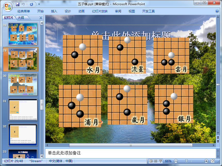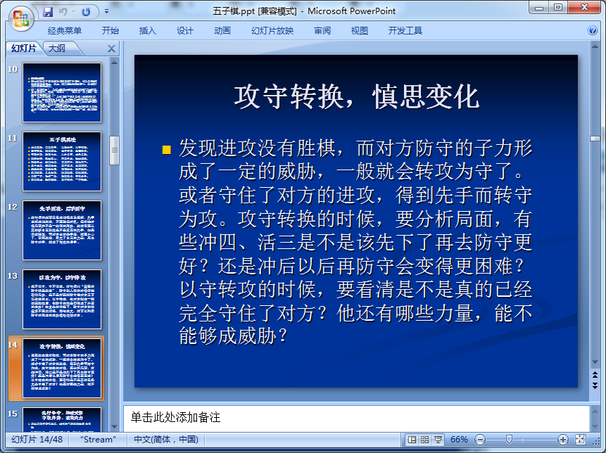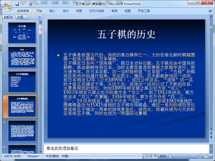 五子棋是一款休闲的益智游戏,经常下五子棋有助于锻炼逻辑思维能力、图像思考能力、忍耐力等好处,这里小编带来五子棋介绍ppt课件,详细的介绍了五子棋的历史由来,规则技巧等,点击下面的地址即可免费下载这份完整版课件。
