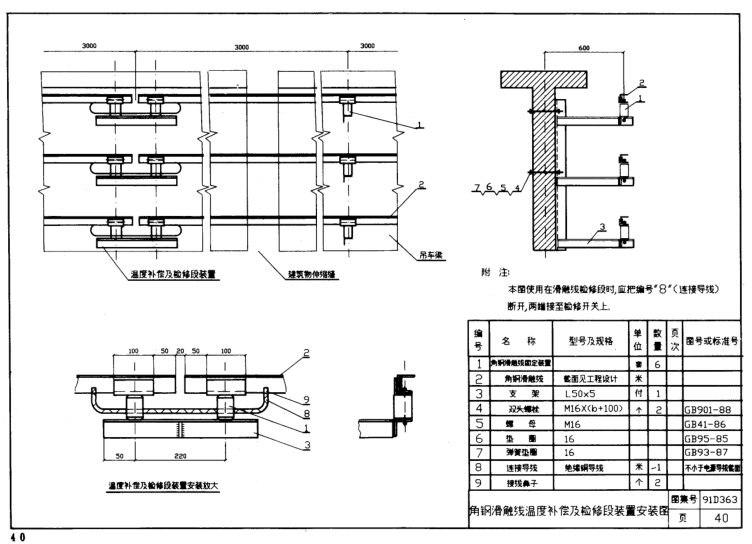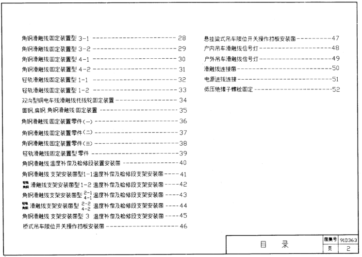 本图集为吊车裸滑触线安装图集,图集号91D363,本图集适用于各种桥式吊车,单梁吊车,电动葫芦三相交流50HZ 380V裸滑触线的安装。