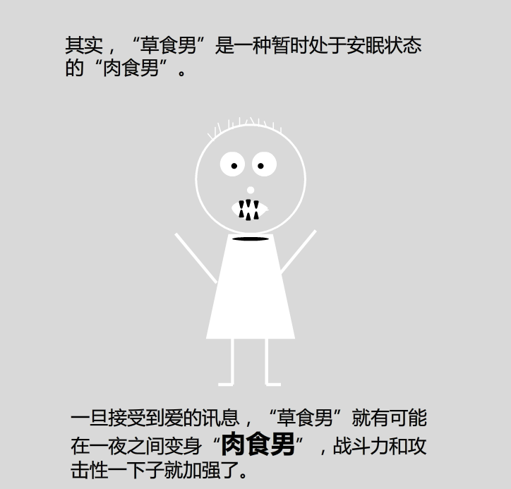 一旦接受到爱的讯息,“草食男”就有可能 在一夜之间变身“肉食男”,战斗力和攻 击性一下子就加强了。 我爱你,情人节,请珍惜你身边的草食男。