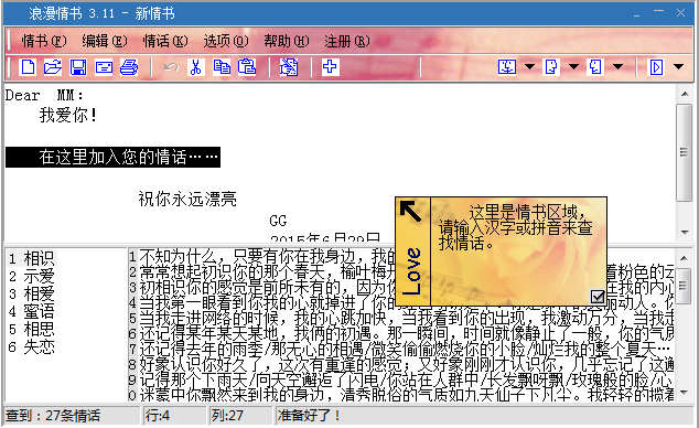 6、除了有详尽的帮助文件之外,还有“情书精灵”及时地提醒您使用的方法;