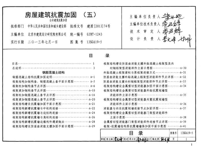 该图集适用于抗震设防烈度为6~8度地区,经抗震鉴定后需要进行抗震加固的现有多(高)层框架结构、多(高)层框架-抗震墙结构、大跨钢结构屋盖的抗震加固。包括体育建筑、电影院、博物馆、档案馆、商场、展览馆、会展中心、旅馆、办公建筑、科学实验建筑等公共建筑。主要内容为:框架结构增设钢构套、钢筋混凝土套加固,增设抗震墙加固,增设防屈曲支撑加固,增设金属屈服型阻尼器加固,增设钢支撑加固、增设粘滞型阻尼器加固;大跨钢结构的杆件加固、支座加固、体系加固;基础的柔性基础改为刚性基础加固、独立基础改为条形基础做法,新加抗震墙基础做法,并给出了某体育馆抗震加固设计示例。本图集列举出较为典型的加固构造措施,是对《建筑抗震加固技术规程》、《建筑抗震鉴定标准》的阐释,可供工程设计人员、施工人员、教学人员使用。