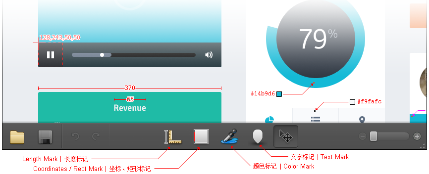 可方便地为设计稿添加标记,极大节省设计师在设计稿上添加和修改标注的时间。马克鳗使用起来也是非常简单,双击添加测量,单击改变横纵方向等等功能,基本都是一键完成。