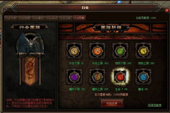 成千上万和你一样来到传奇大陆的小兵,在成长的路上会不断接受更危险的挑战,所以一定要加入行会。每个行会都有属于自己的图腾文化,图腾蕴含的强大力量需要每一位行会成员去点燃!点击图腾祈祷,消耗一定的贡献度即可提升行会图腾等级,同时获得自身属性加成。