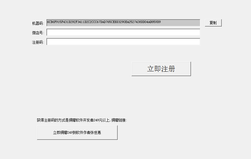 2、为了让作者有更多的时间去维护该软件,请捐赠作者249元,然后把机器码和微店号发给客户QQ1,客户QQ1会给你一个注册码,输入注册码后按立即注册,注册成功.